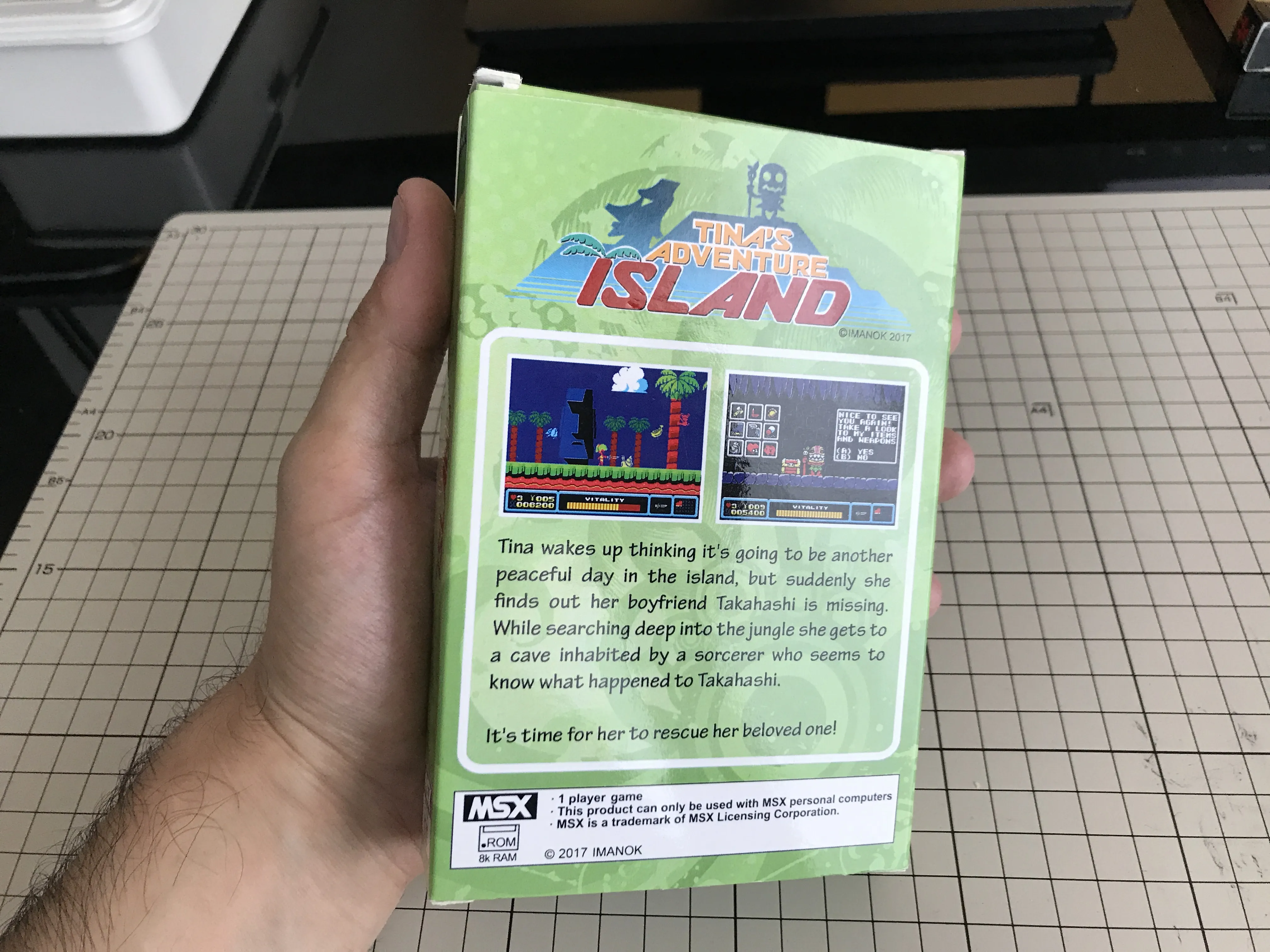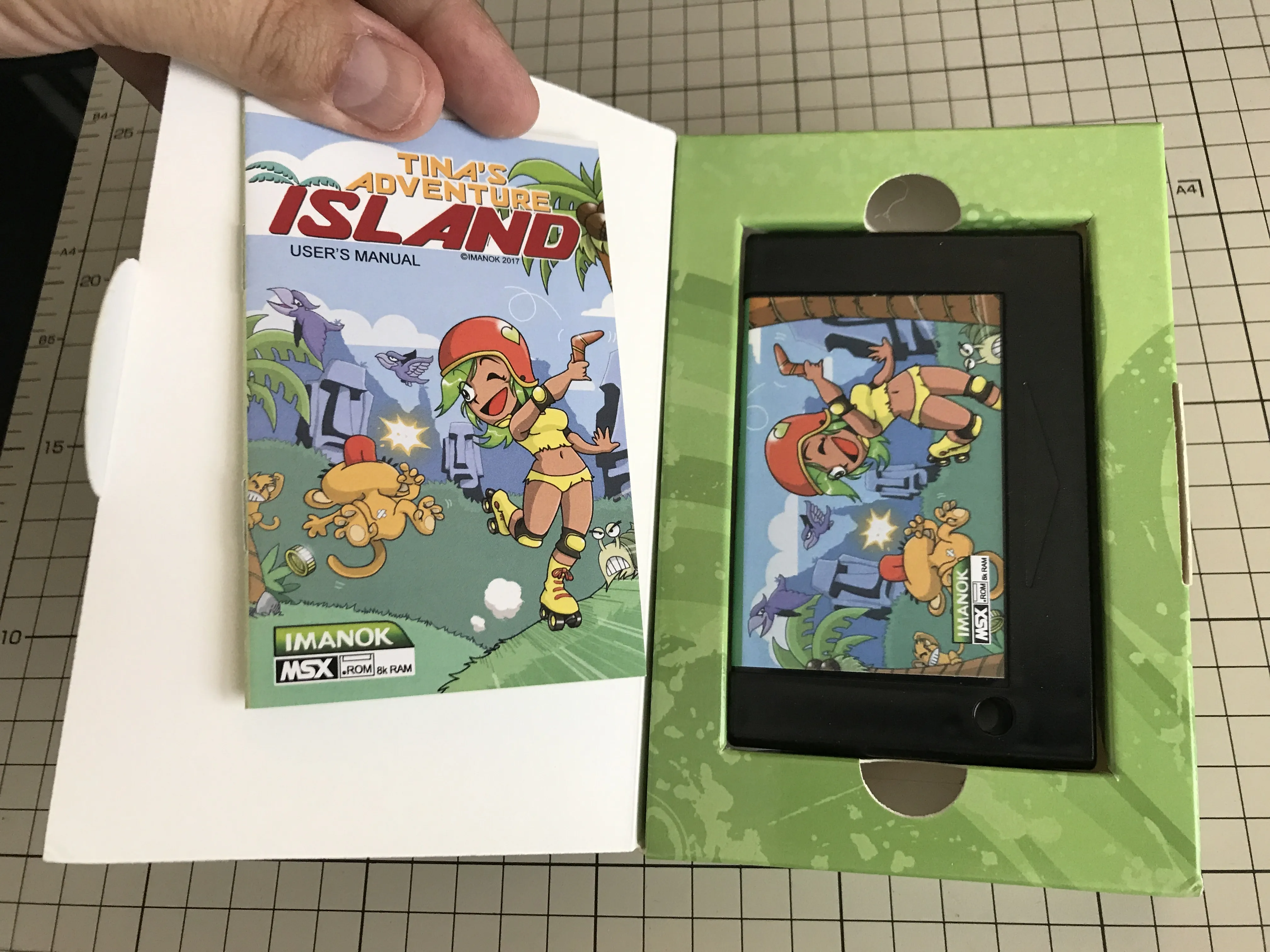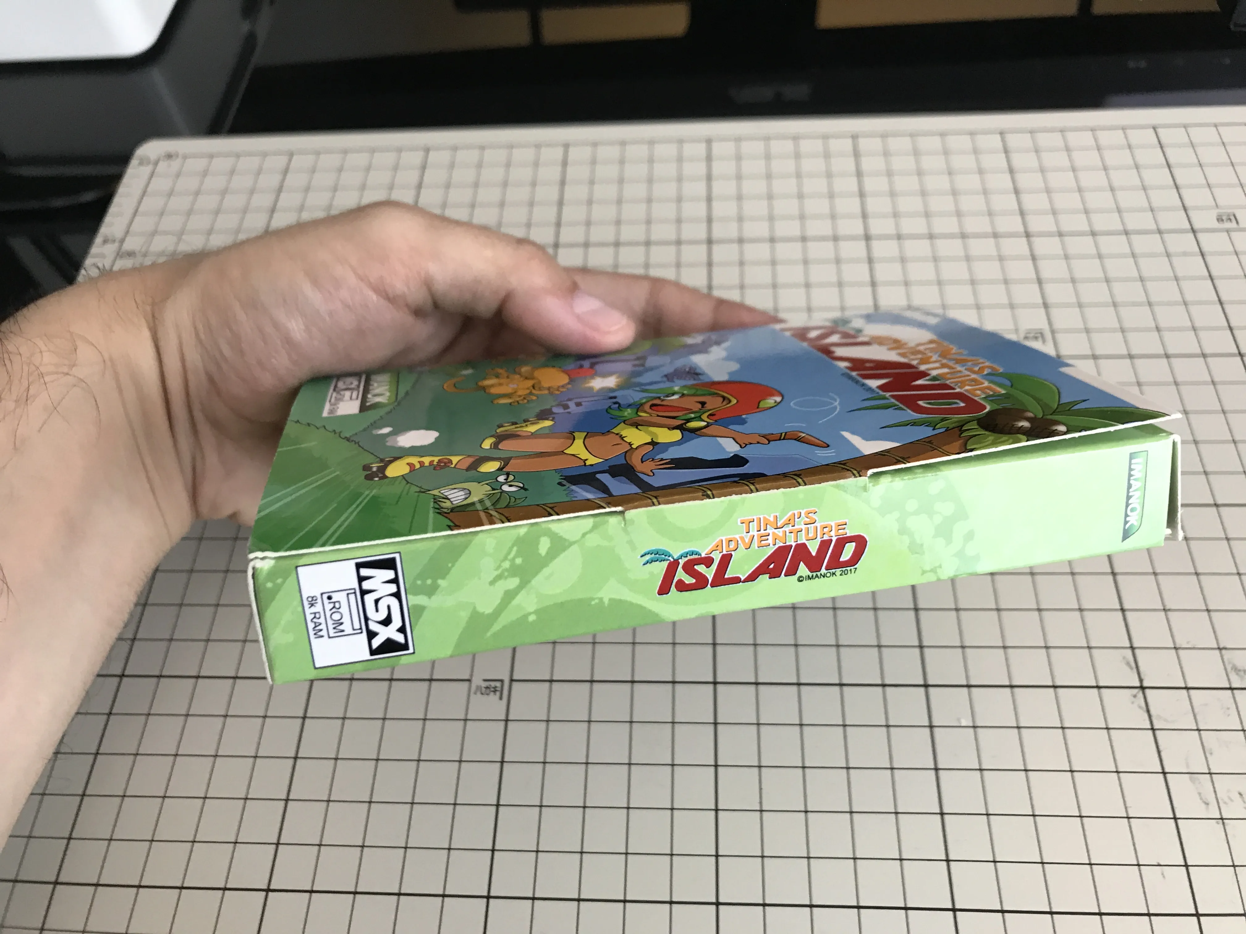 Externally the box looks very similar to MSX Cartridge Shop's, but there are a few differences. It feels a bit sturdier, probably because the inside of the cover is twice as thick as Manuel's. This also means that the back is also printed and glossy instead of being white cardboard.
