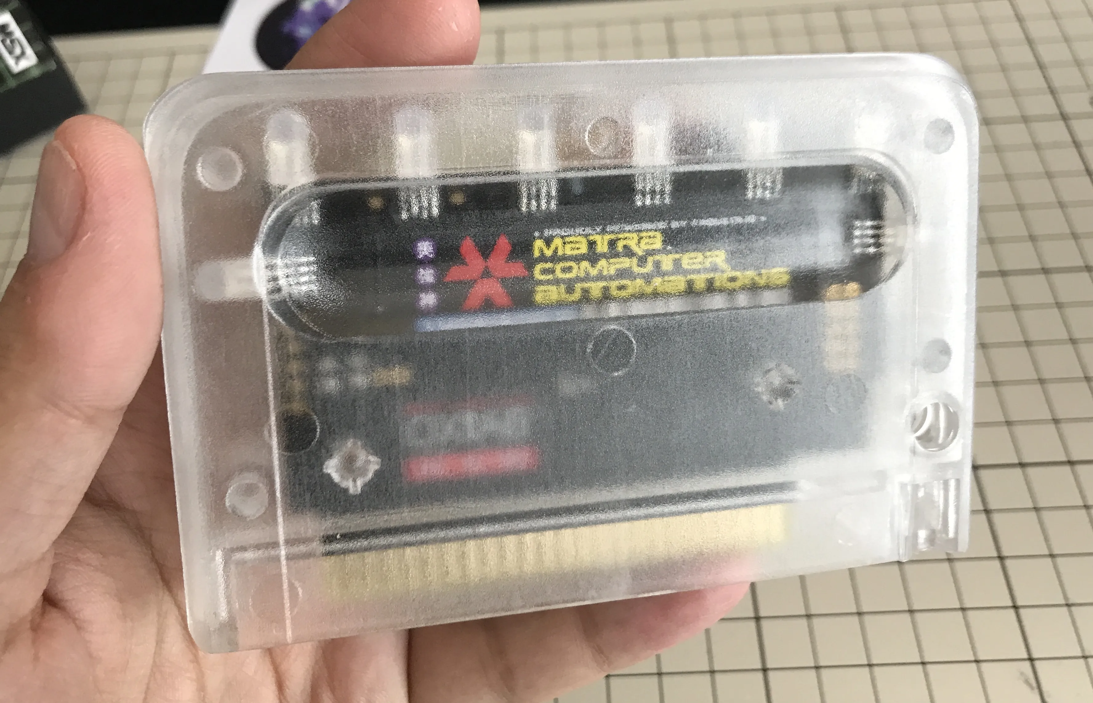 We know that Matra have produced cartridge with native ROM files as well as MSX-BASIC games converted to ROM with DSK2ROM. They're able to produce flat ROM cartridges of up to 64KB, as well as MegaROMs with internal mapper. Not only this, but circuit board customizations are also possible. As an example, if you look closely at the Bitlogic cartridge you'll see eight RGB LEDs inside that produce ambient light of different colors as the game progresses.
