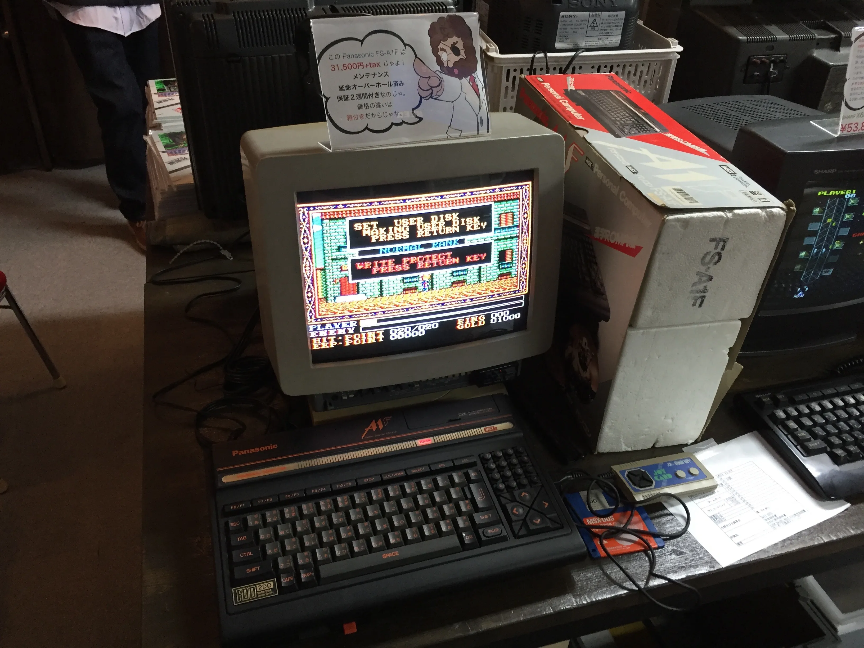 Next there was Mr. Nakagawa, owner of the Kaden no Kenchan store. He didn’t bring his RE:birth sound board this time, but he had lots of software for sale, including lots of MSX cartridges (both standalone and boxed).