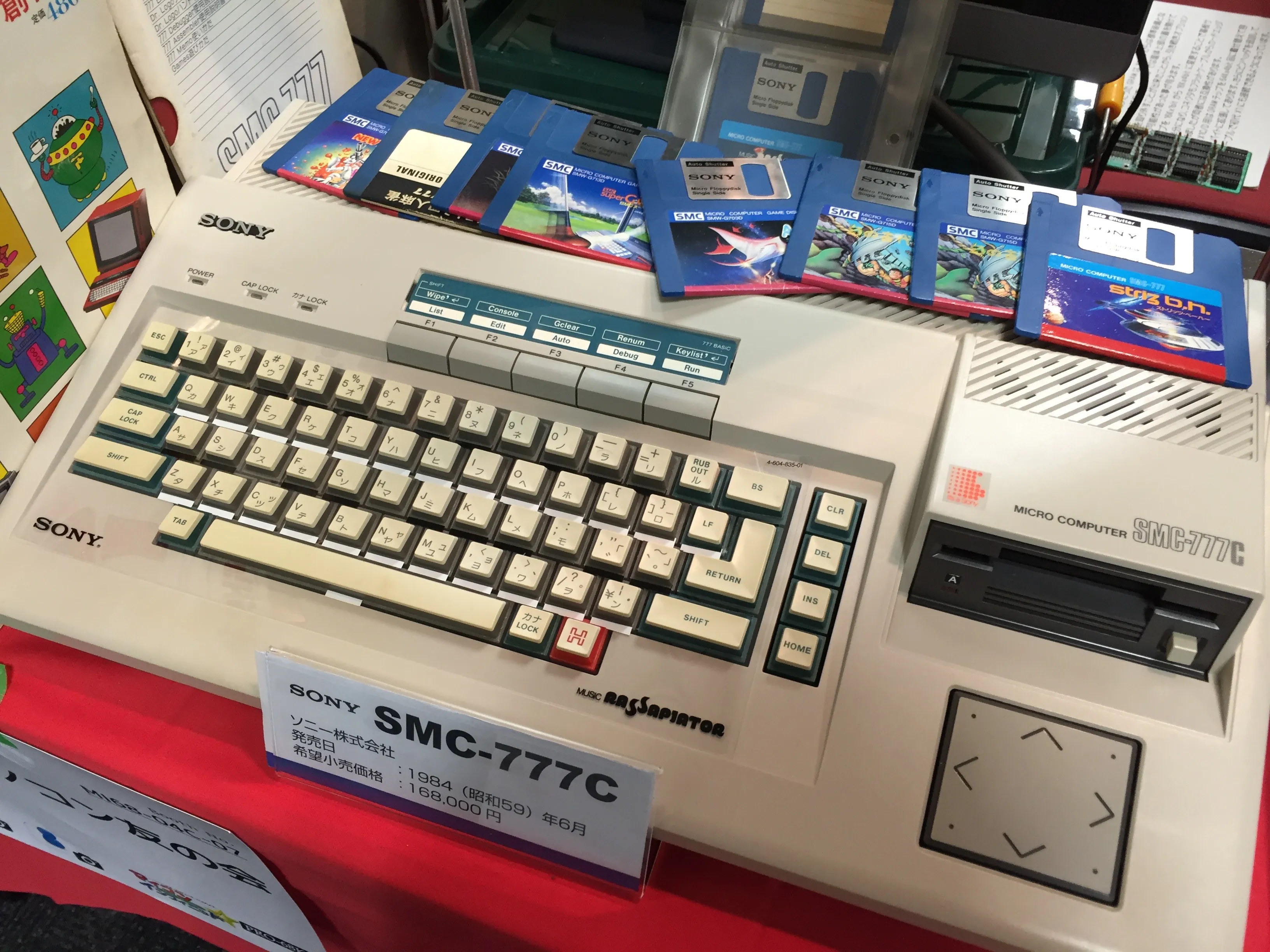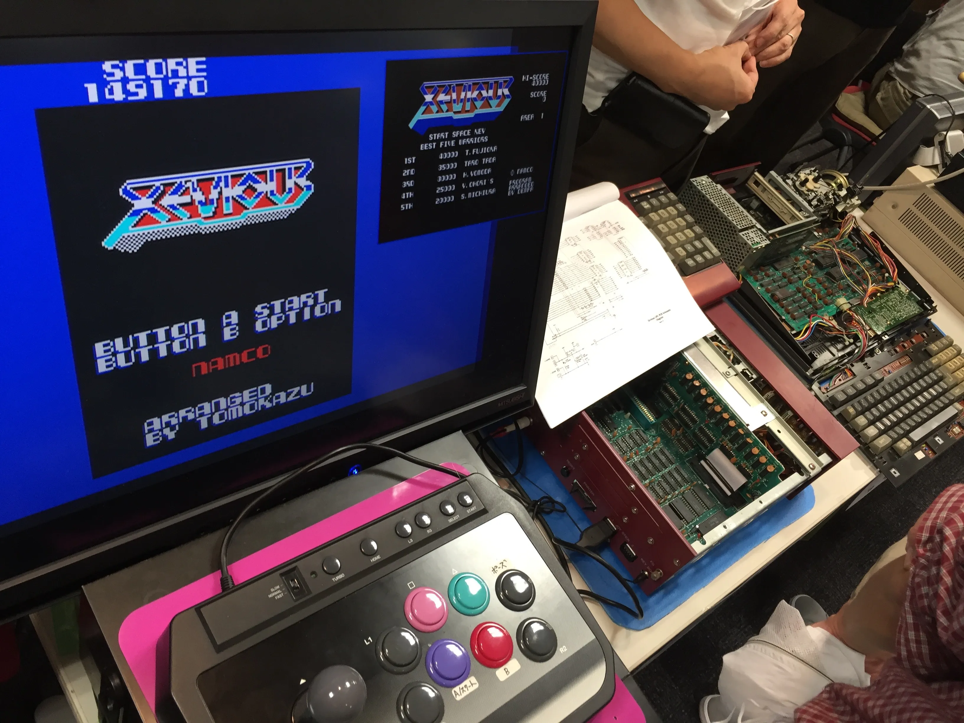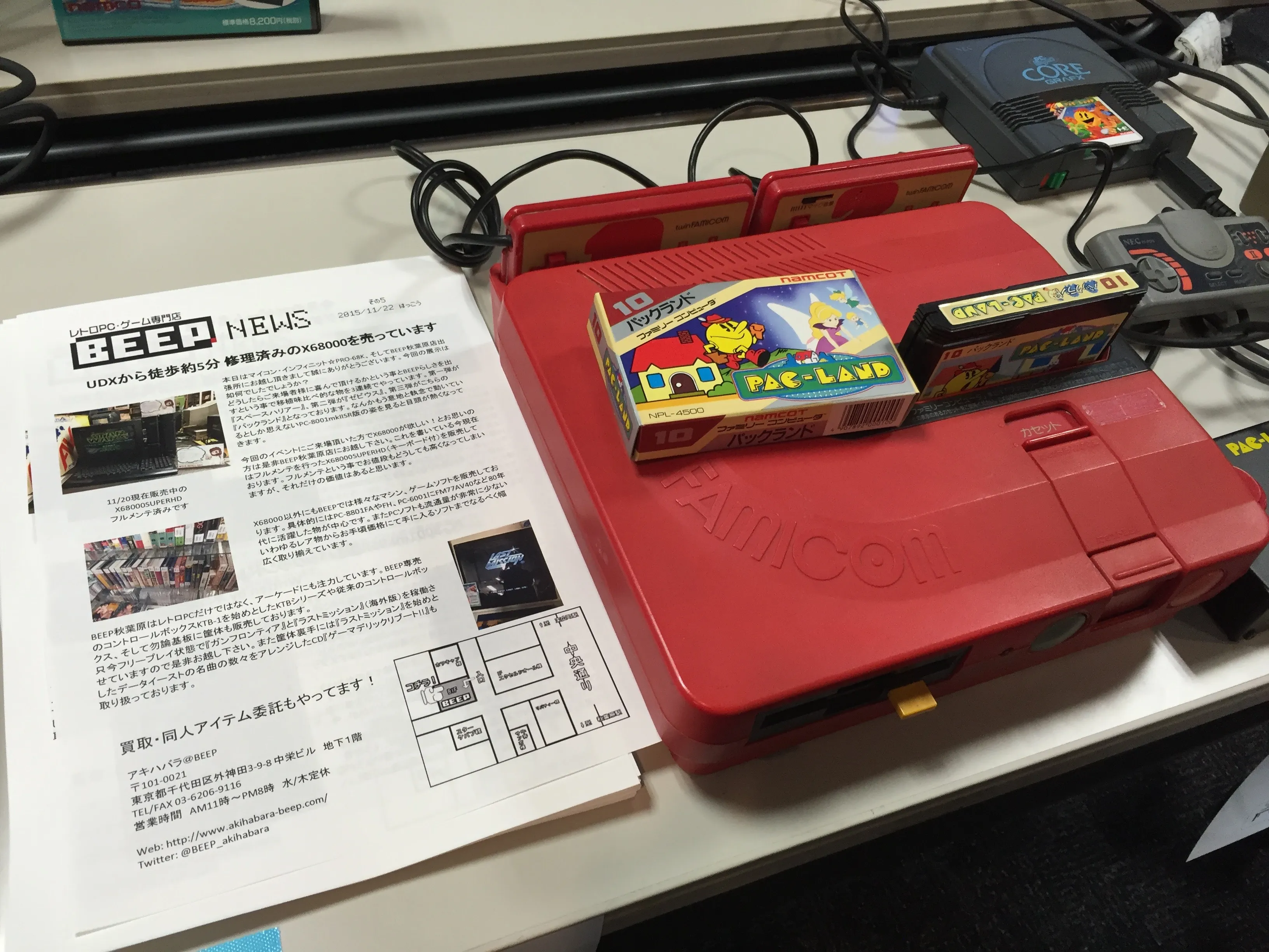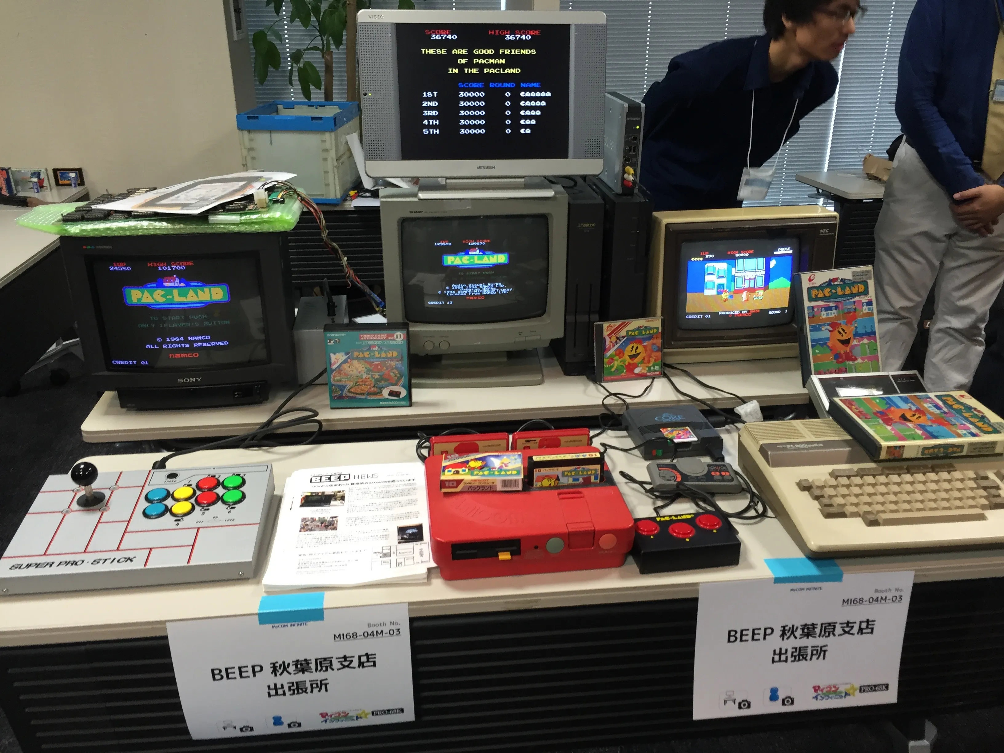 Next to Mr. Maeda there was the stand of BEEP Akihabara, the retro shop that opened recently and has lots of MSX material (including lots of unopened, never used Pioneer PX-V60 computers!). In their stand they had several versions of Pac-Land running on different platforms: an NEC PC-8001mkIISR (right), a Sharp X68000 (back table, center), a Twin Famicom (center), a PC Engine Core Grafx (center, right of the Famicom) and the original arcade board (left, on top of the display). They also had some pamflets with information about their store.