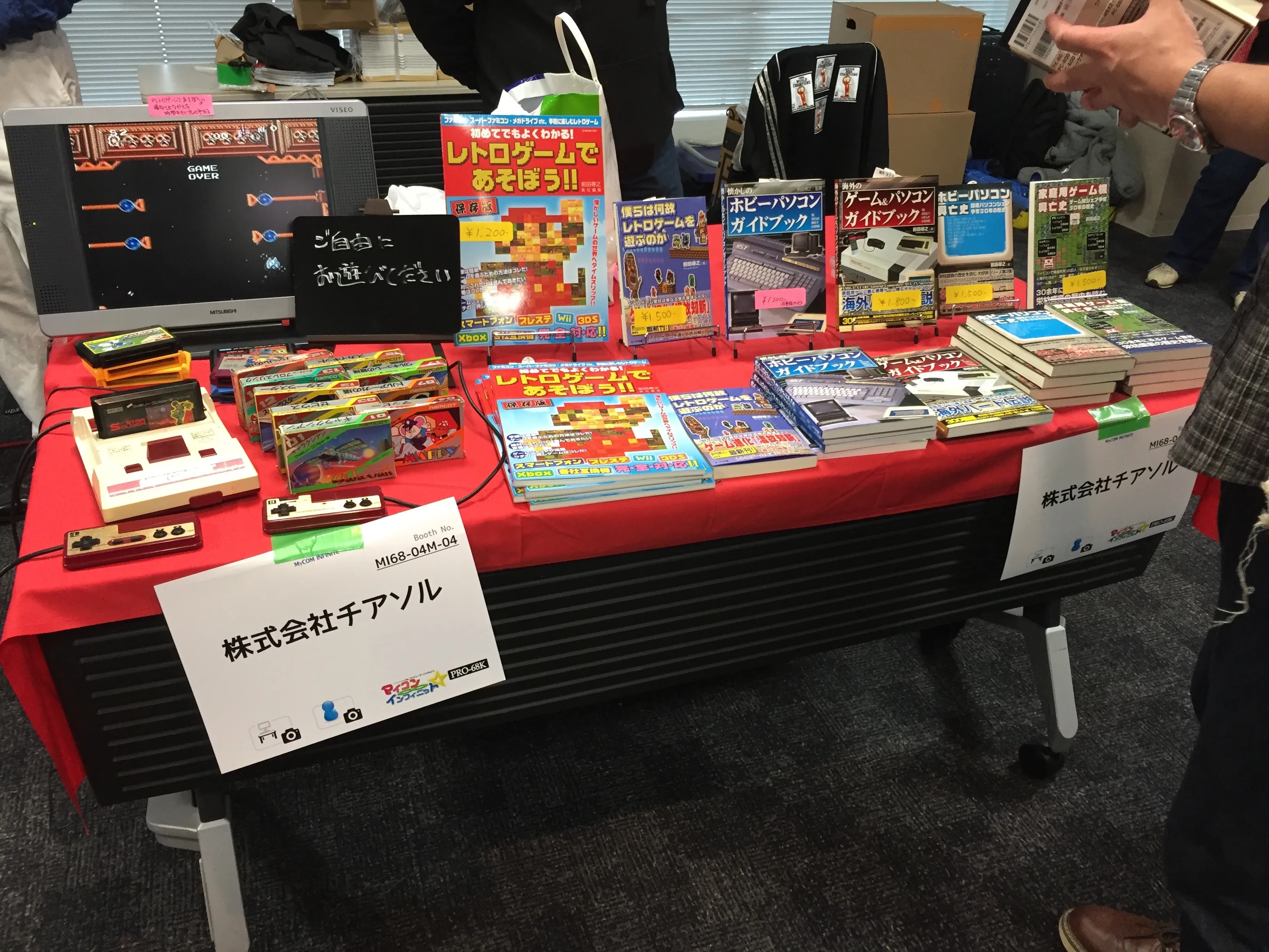 First I went to talk with Mr. Hiroyuki Maeda, who has already published several books about retro computers and consoles. In his stand he was showcasing and selling his new book about retro console games. Besides the books he had a Famicom with a couple of controllers and several games for visitors to play.