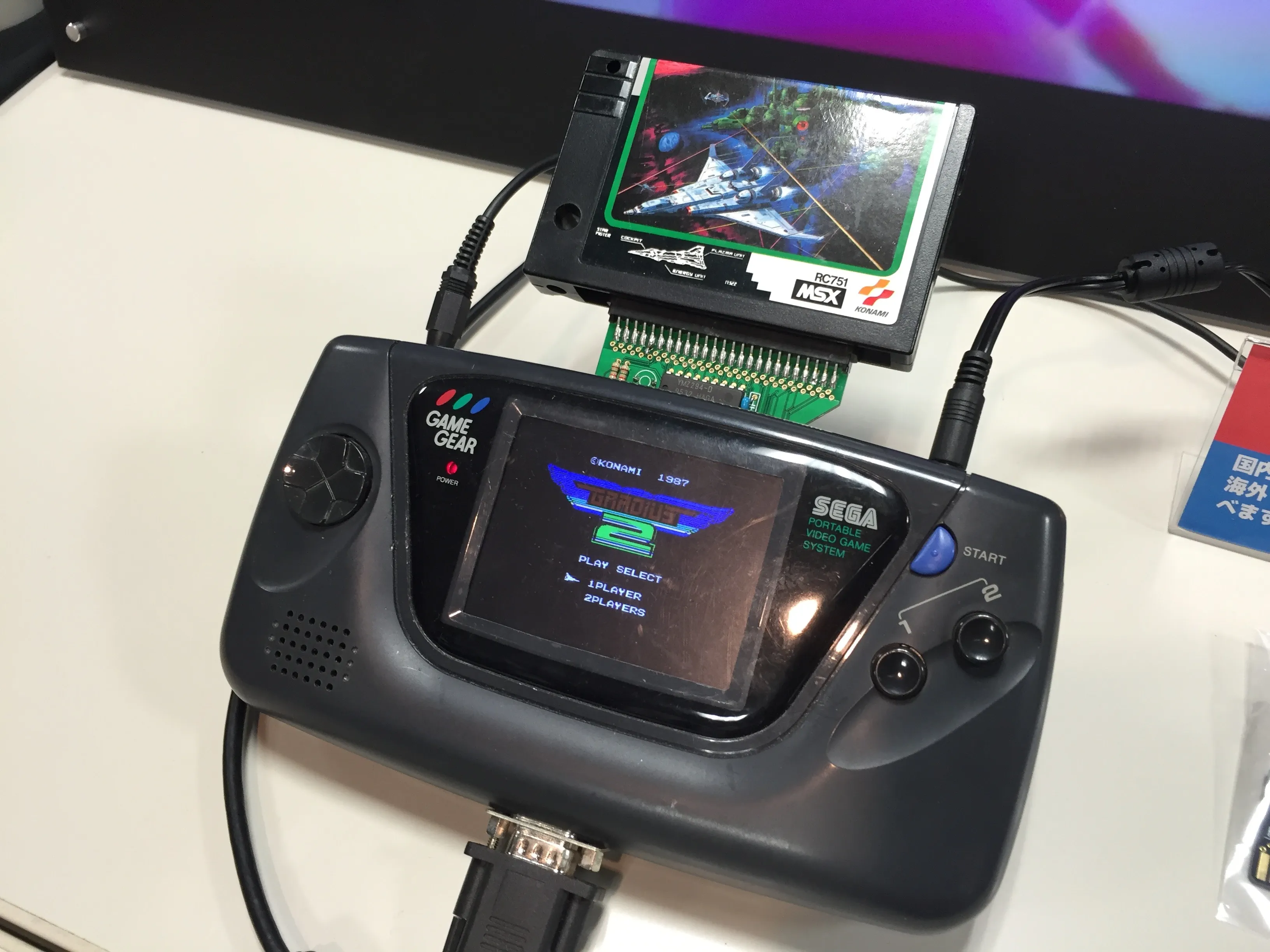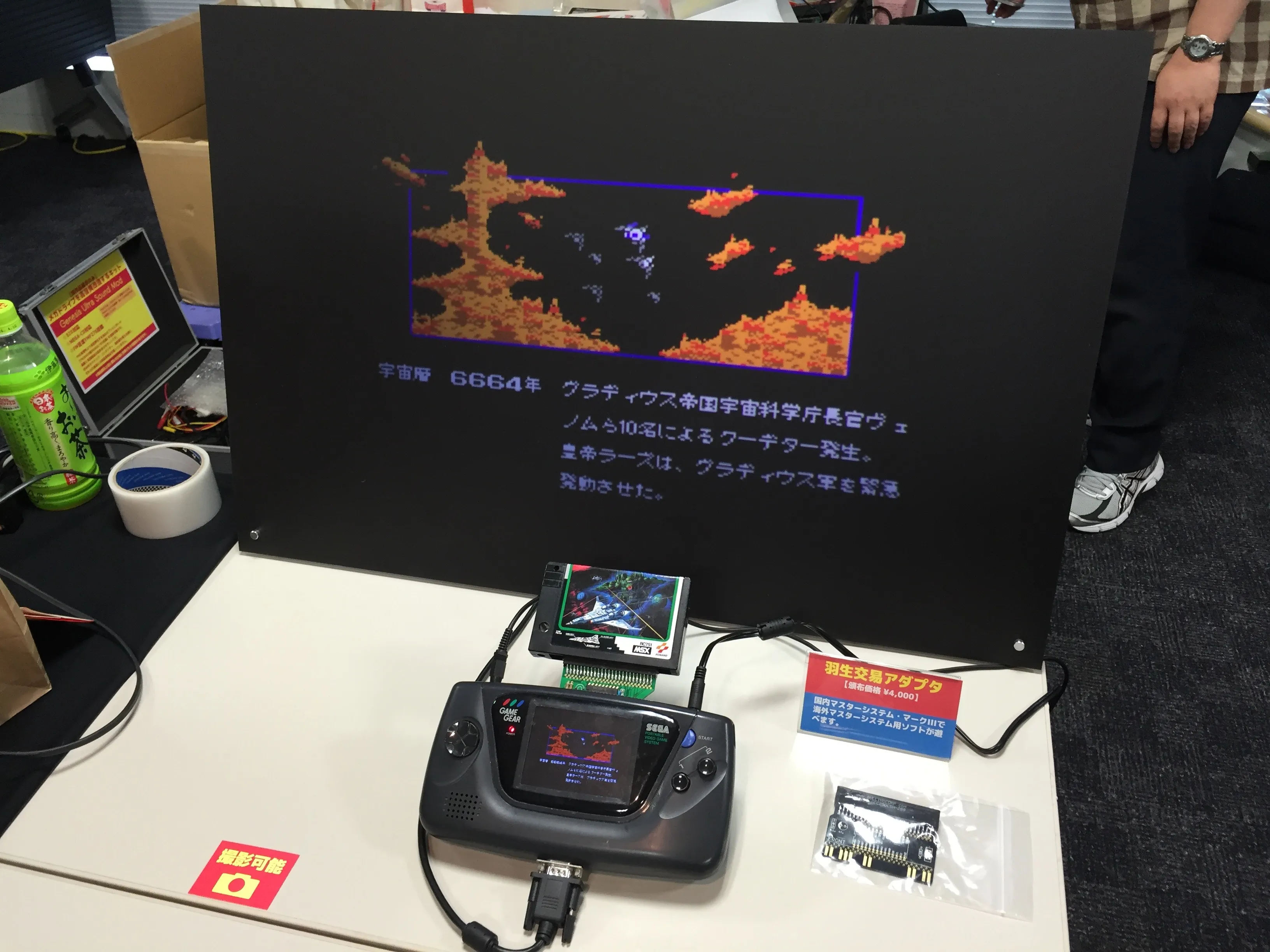 First, MEGA-NEO ∏ was showcasing and selling adapters to play MSX cartridges in a Game Gear. They had a gorgeous-looking projector that made Gradius 2 look amazing. Oh, and the SCC sound worked as expected! Another interesting feature of this adapter was the possibility of using a Wii remote as a game pad to control the MSX games.