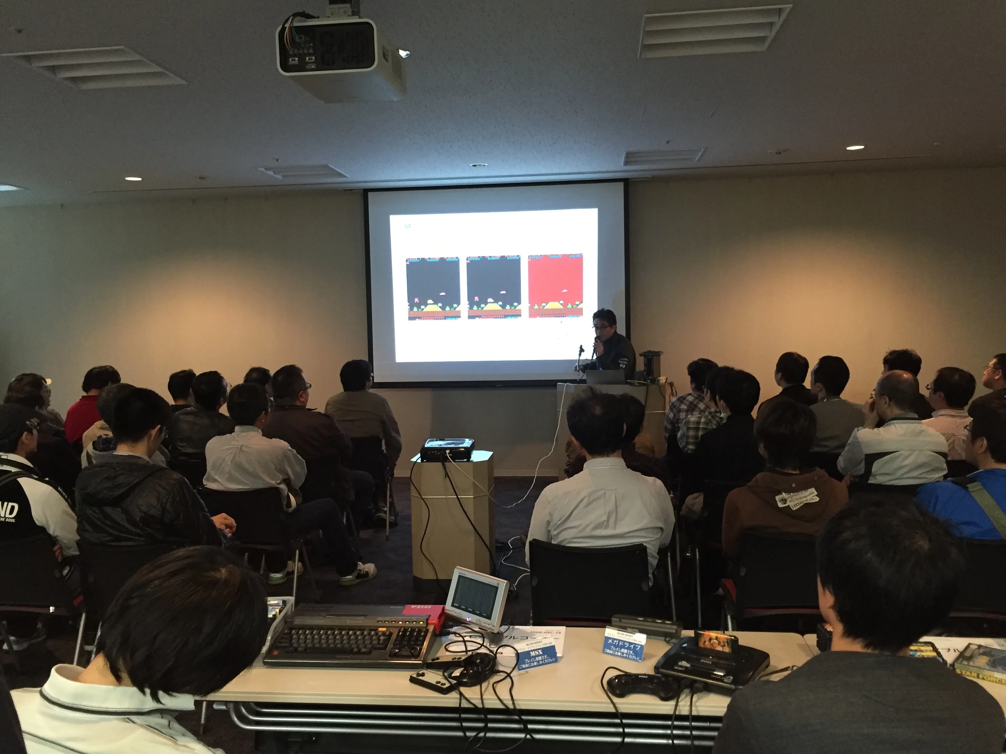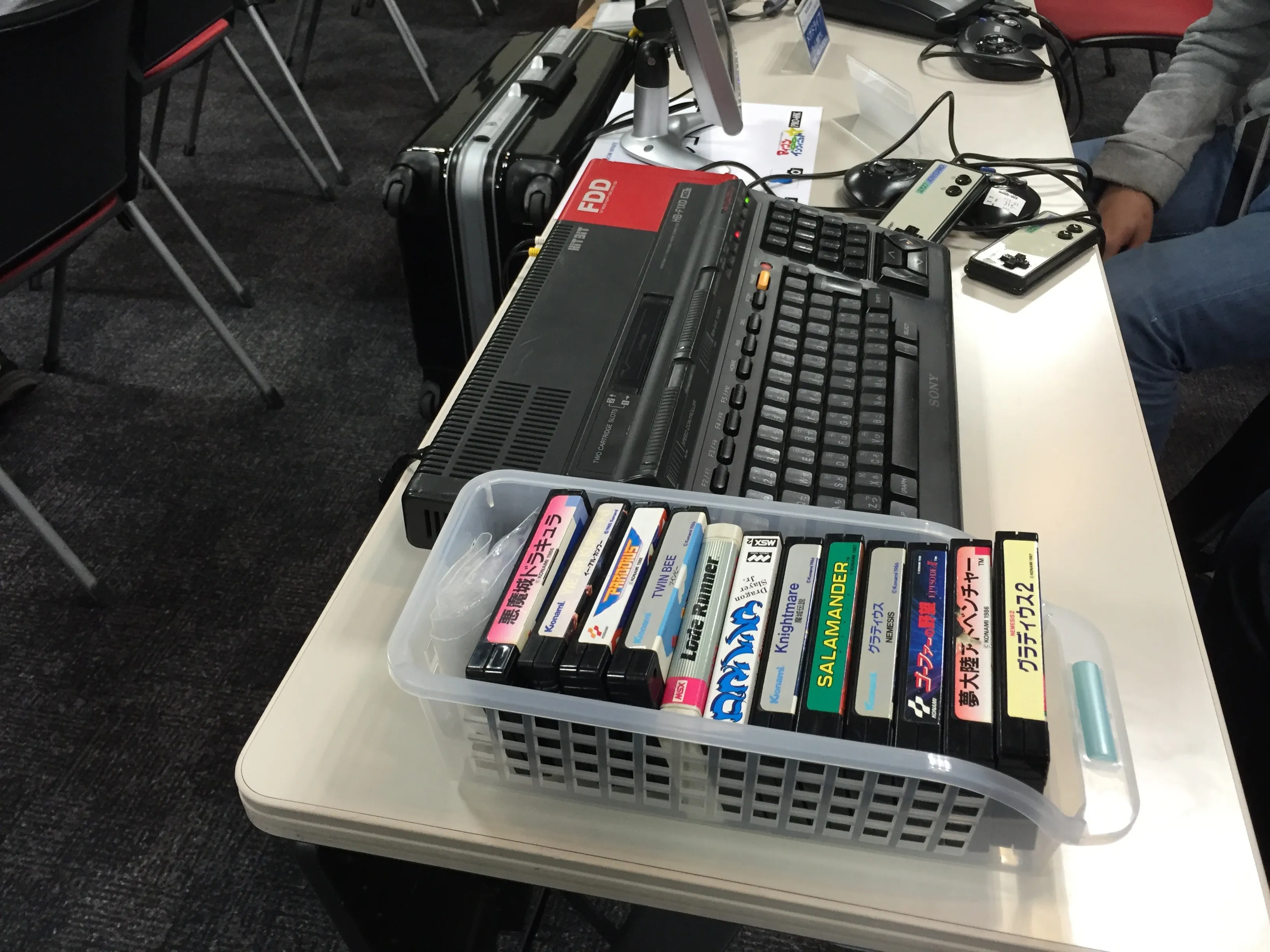 In the center of the room the were a couple of tables, one with a Sony HB-F1XD connected to a small screen and a box of cartridges, and another with a Sega Megadrive also with several games. Those were free to anyone to sit and play.