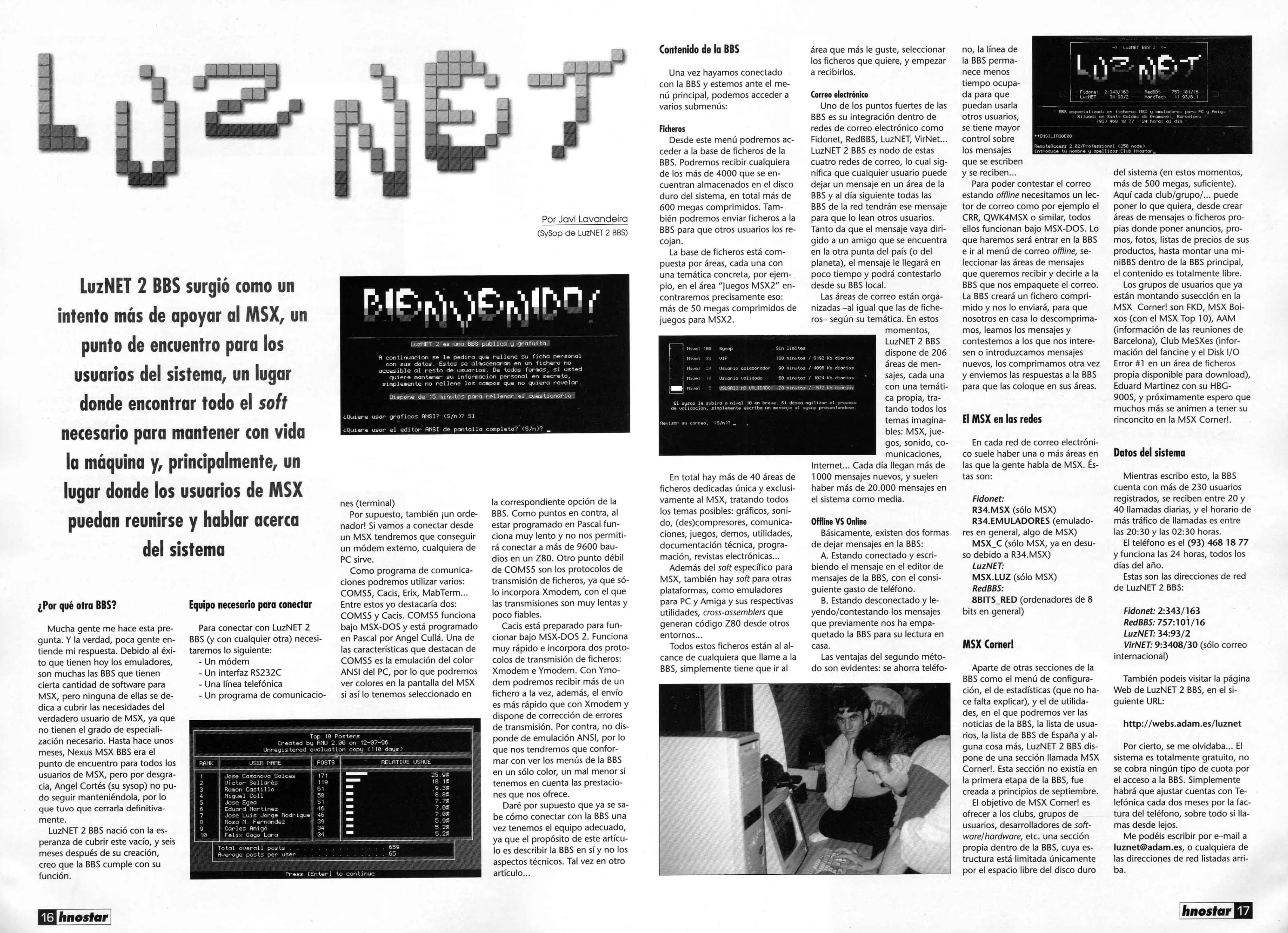 LuzNET 2 was a dial-up Bulletin Board System (BBS) that I operated from 1993 to 1998, before the Internet became mainstream (or even popular) in Spain. It was focused on MSX computers.