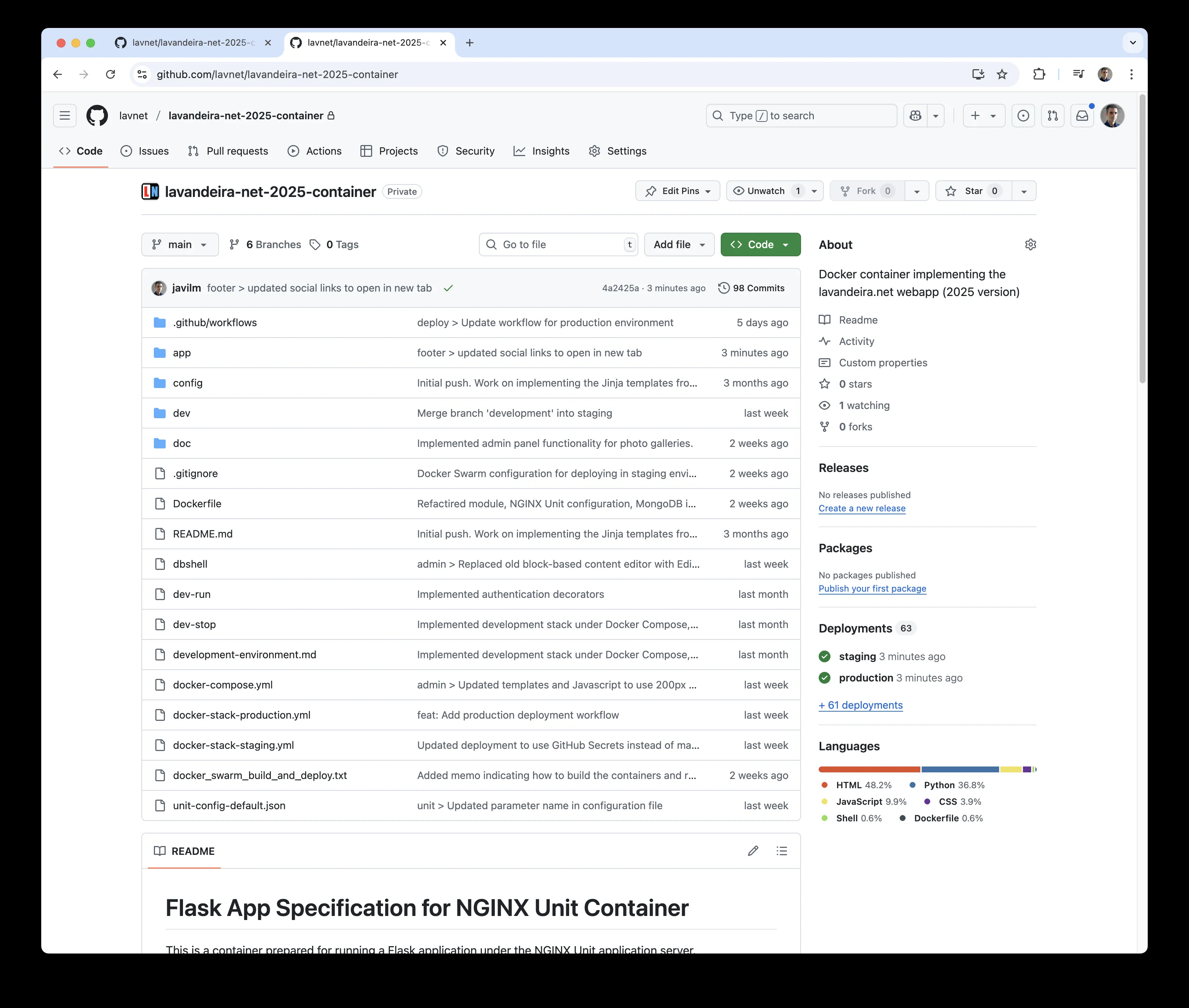 The application is built around stateless Docker containers running as a replicated Docker Swarm service. These containers are rebuilt and redeployed automatically using a CI/CD workflow in GitHub Actions.