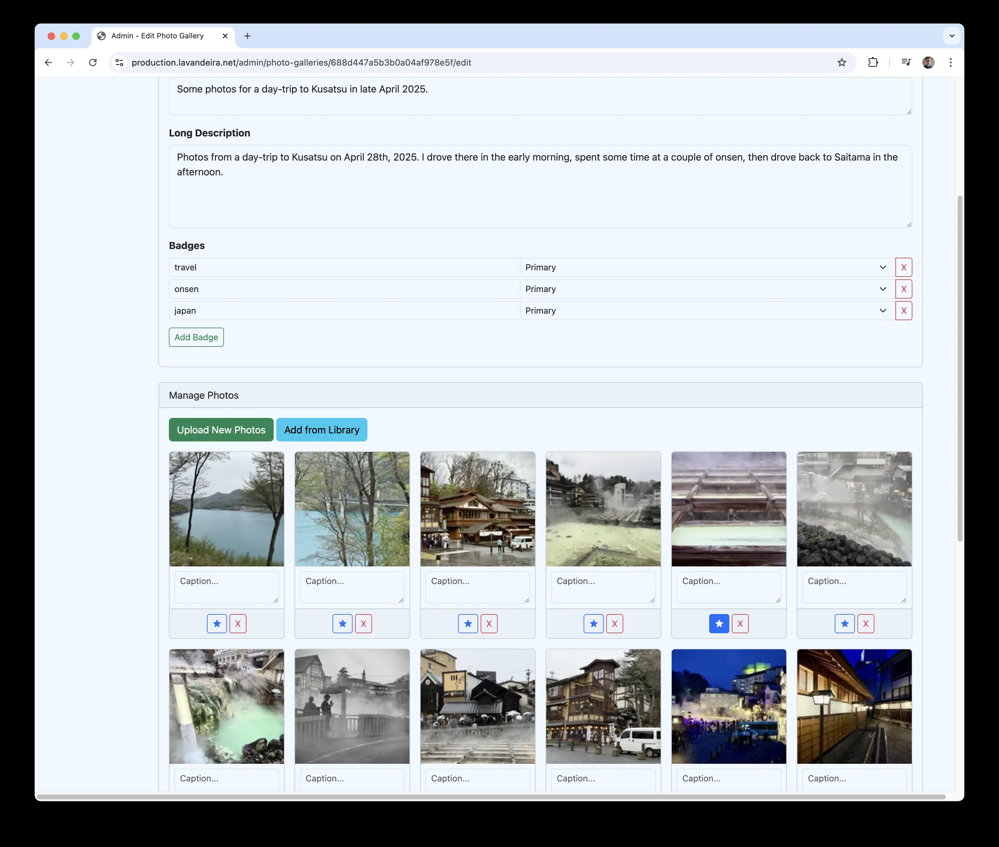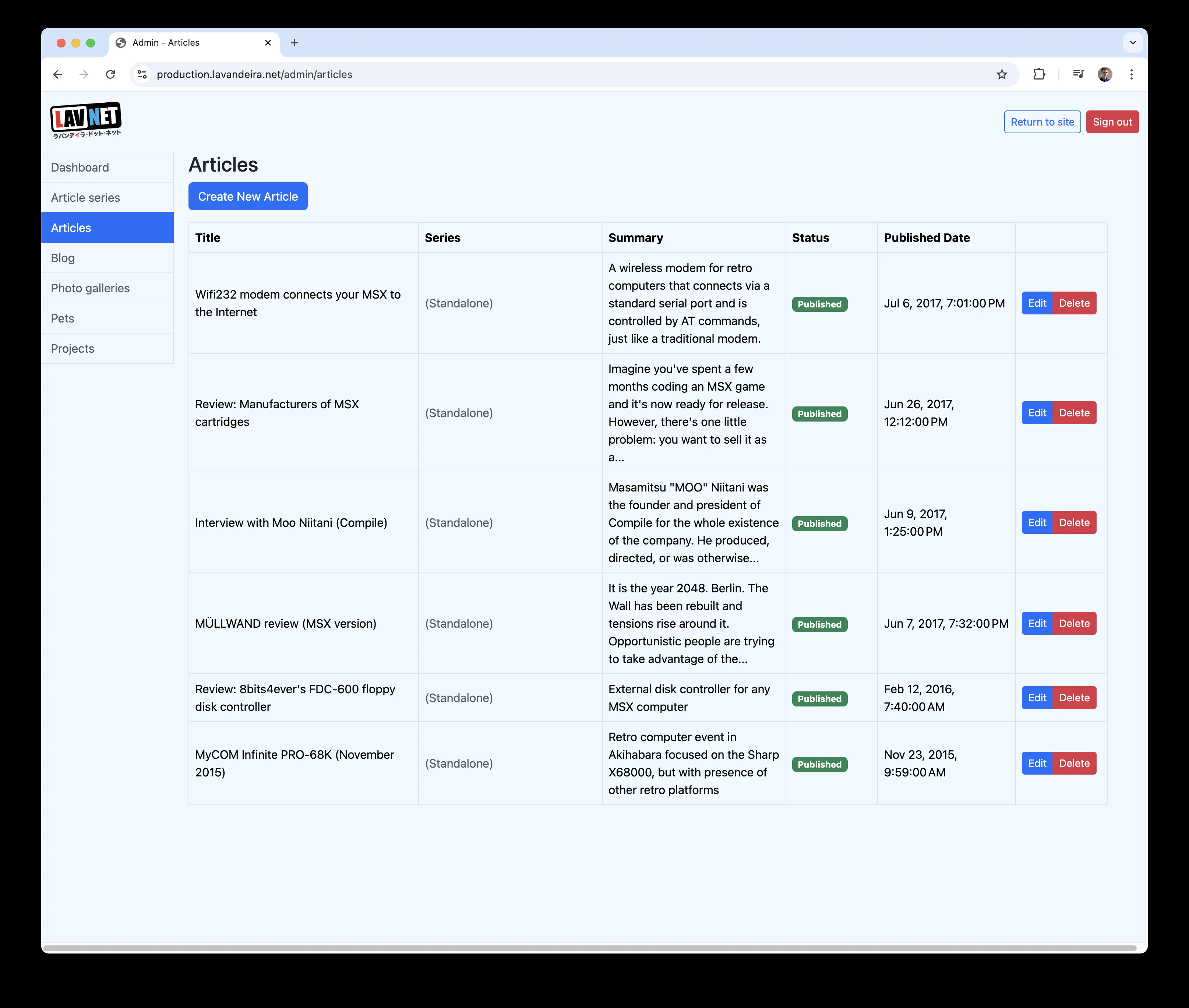 There's a very simple, but functional, web administration backend for me to add and manage content, such as articles, blog posts, projects or photo galleries.